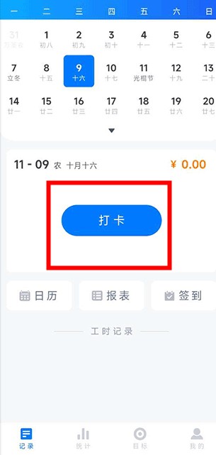 在软件主页面,您可以轻松进行打卡操作,记录您的工作时间,确保工时的准确无误。