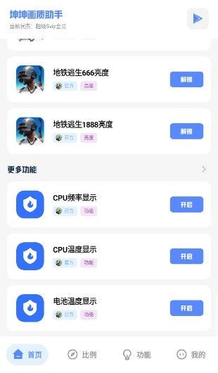 坤坤画质助手能为用户带来超广角的画质优化服务,同时支持提升游戏帧率,可稳定锁定至120帧。软件多种实用功能,助力用户轻松获取更优质的游戏体验,并且兼容多个不同服务器的吃鸡游戏。
