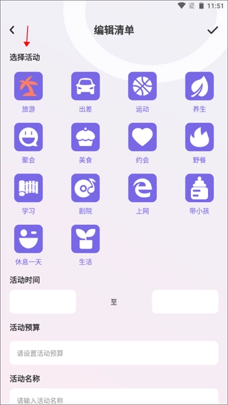 2、挑选好你的活动类型、活动时间、需打包的物品等信息后,点击右上角的对钩图标即可。